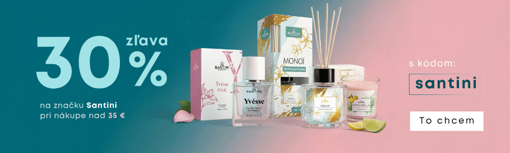 Ušetrite 30% na nákupe! Stačí vybrať produkty značky Santini v minimálnej hodnote 35 €, v košíku zadať kód SANTINI a zľava je vaša. Ľubovoľne kombinujte parfumy, vône do bytu, parfumy do bielizne, vône do auta aj kozmetiku.