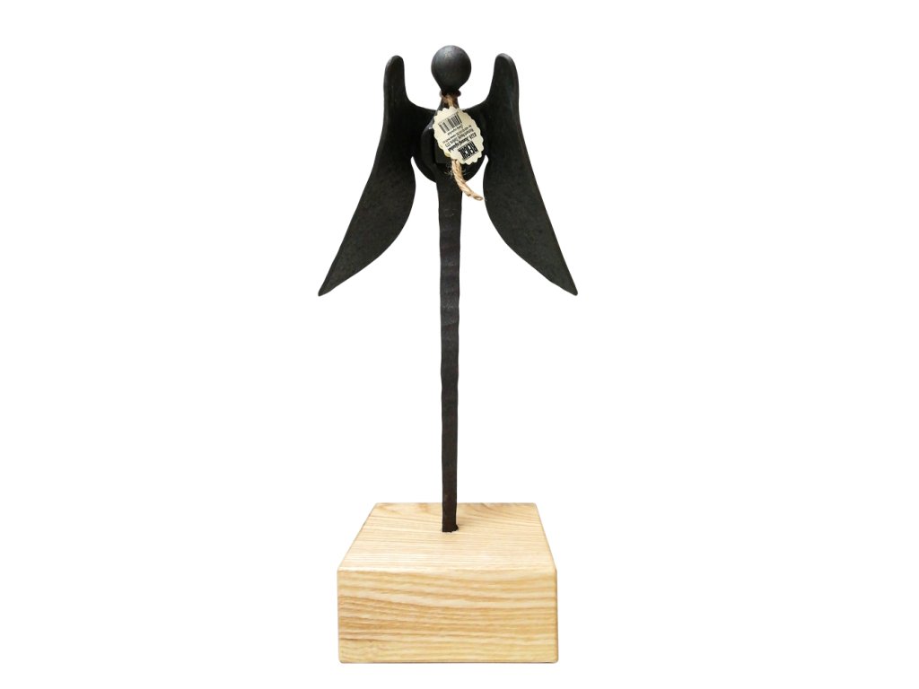 Ručne kovaný anjel so zloženými krídlami na drevenom klátiku.
