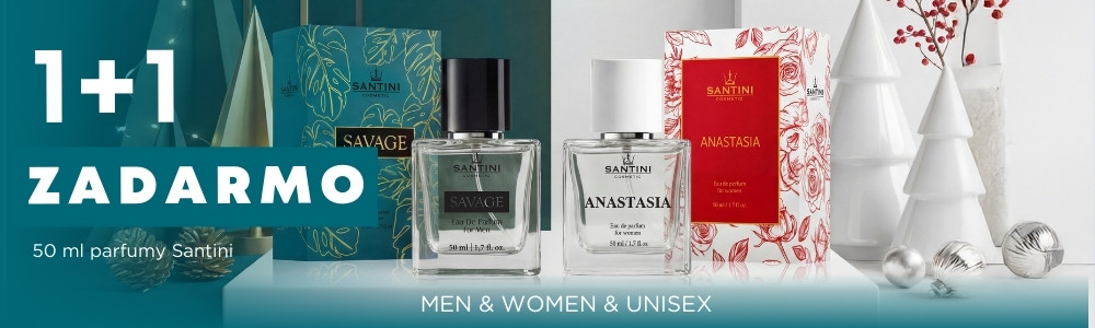 Vaša najobľúbenejšia akcia je späť! Nakúpte 50 ml parfumy Santini so 50% zľavou. Hoďte do košíka minimálne 2 parfumy a ten lacnejší z nich máte ZADARMO! Nezabudnite však všetky parfémy hodiť do košíka, bez nich sa zľava neuplatní.